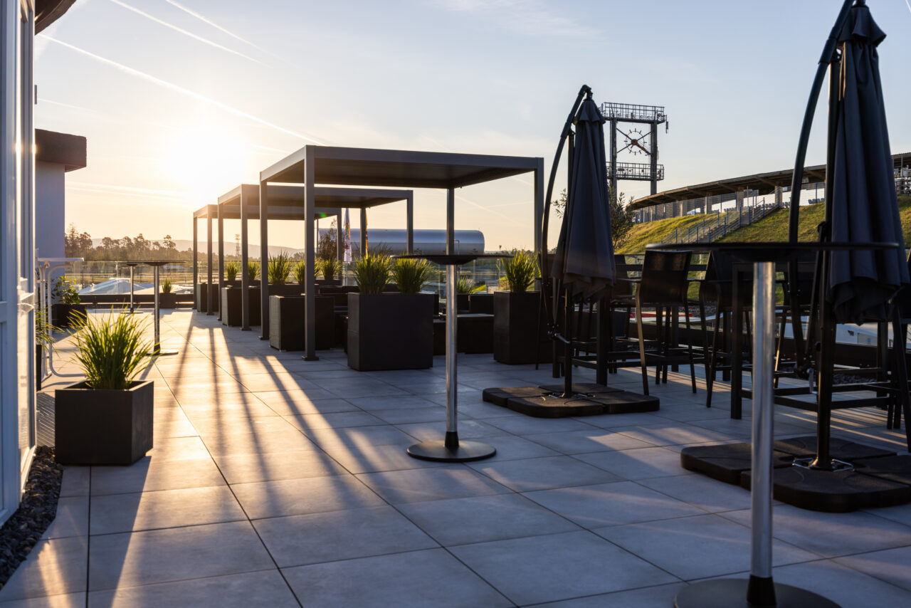Take a look at the breathtaking panoramic terrace of the South Grandstand, which offers you a fantastic view of the world-famous Motodrom and is perfect for unforgettable evening events! Dive into a world of beauty and magic as you watch the sunset from our exclusive venue.
