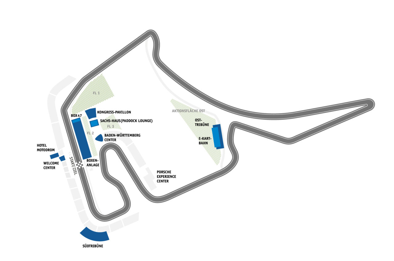 This futuristic building is located right next to paddock 2. Due to its unusual shape, you can enjoy close to panoramic views from level 4 and 5 of most of the racing circuit, including the legendary Sachs-Curve. Enjoy views of the Motodrom, the pit area, the paddock or the ADAC driving safety centre from 15-20 m above the circuit. All rooms are air-conditioned and equipped with black-out blinds. There is a small covered terrace on level 3. The building is serviced by two lifts.